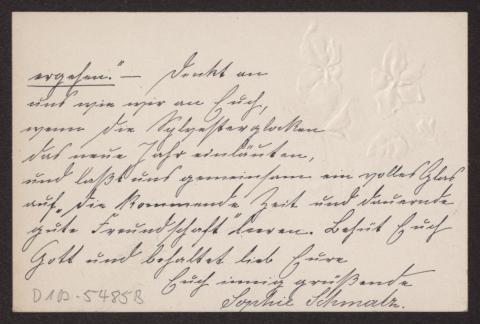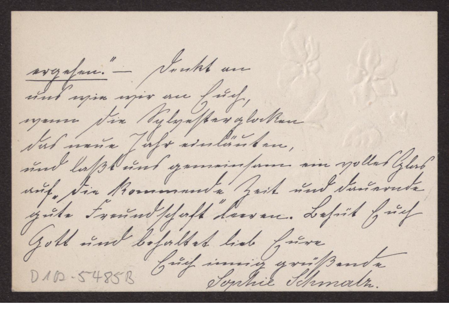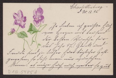 Transkription s. D 102-5501, zum Inhalt des Schreibens s. D 102-5503 Blatt beidseitig beschrieben, mit einer farbigen Zeichnung von zwei Stiefmütterchen, die ein Gesicht haben.