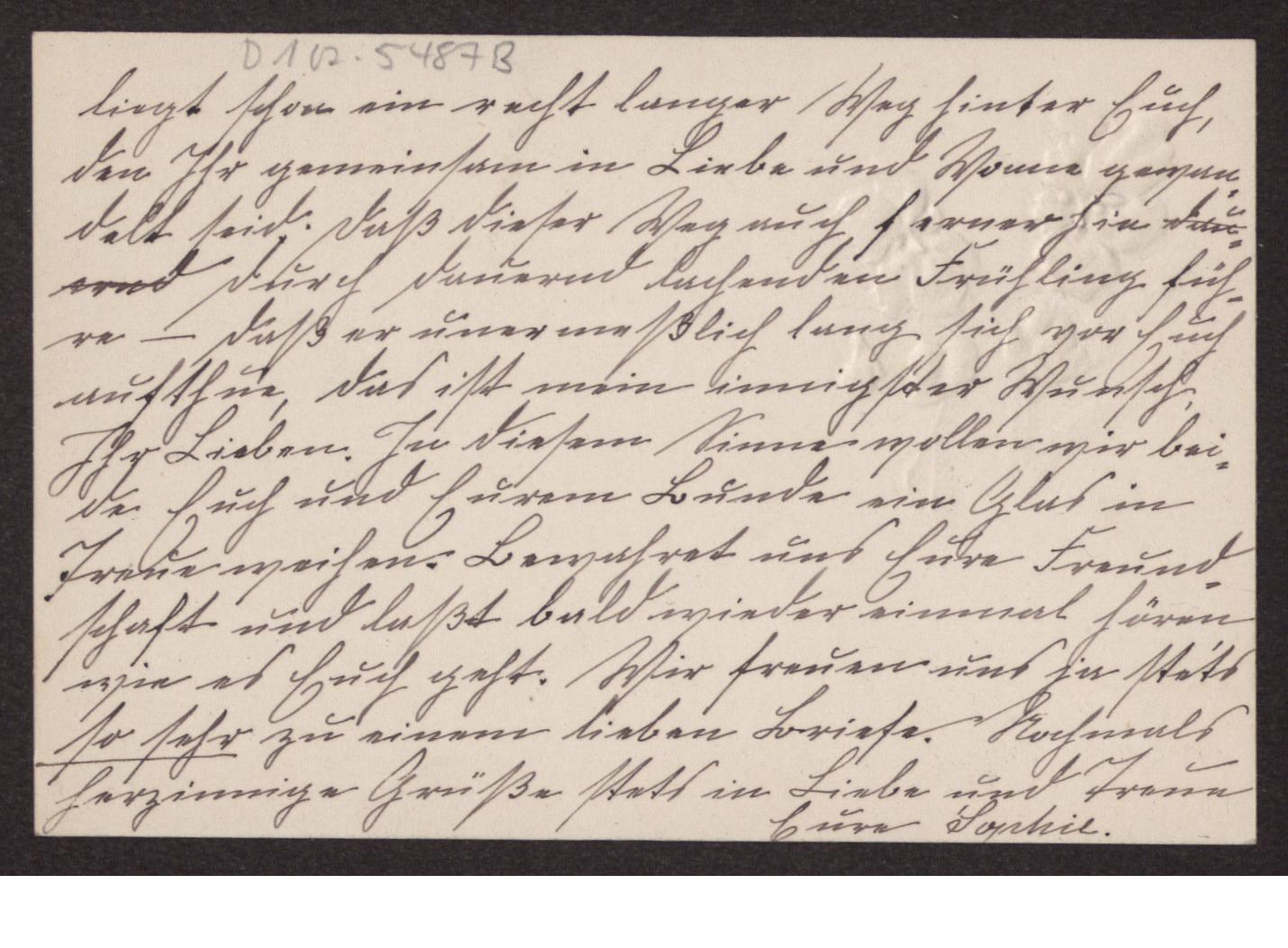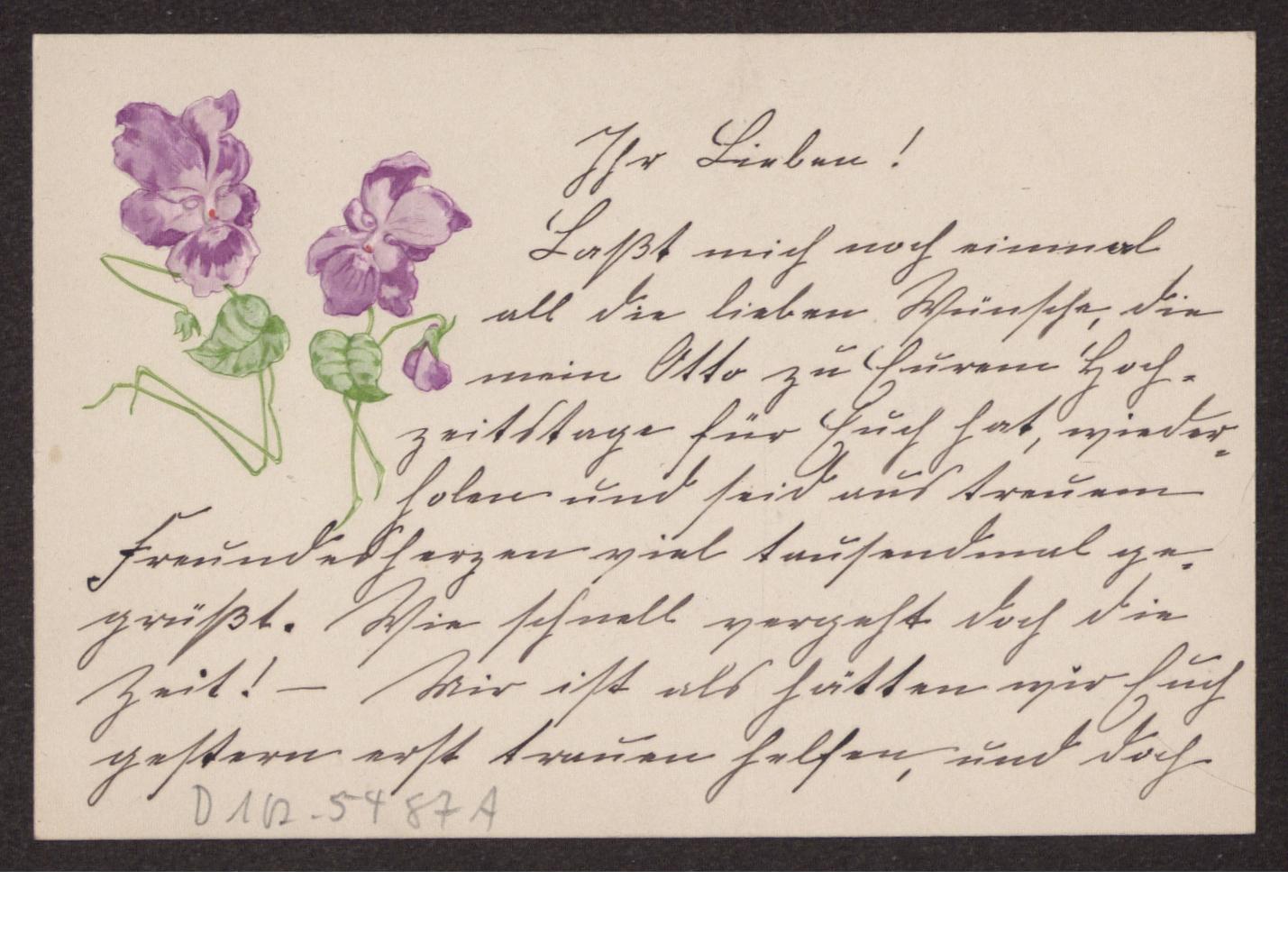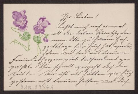 Blatt beidseitig beschrieben, mit einer farbigen Zeichnung von zwei Stiefmütterchen, die ein Gesicht haben.