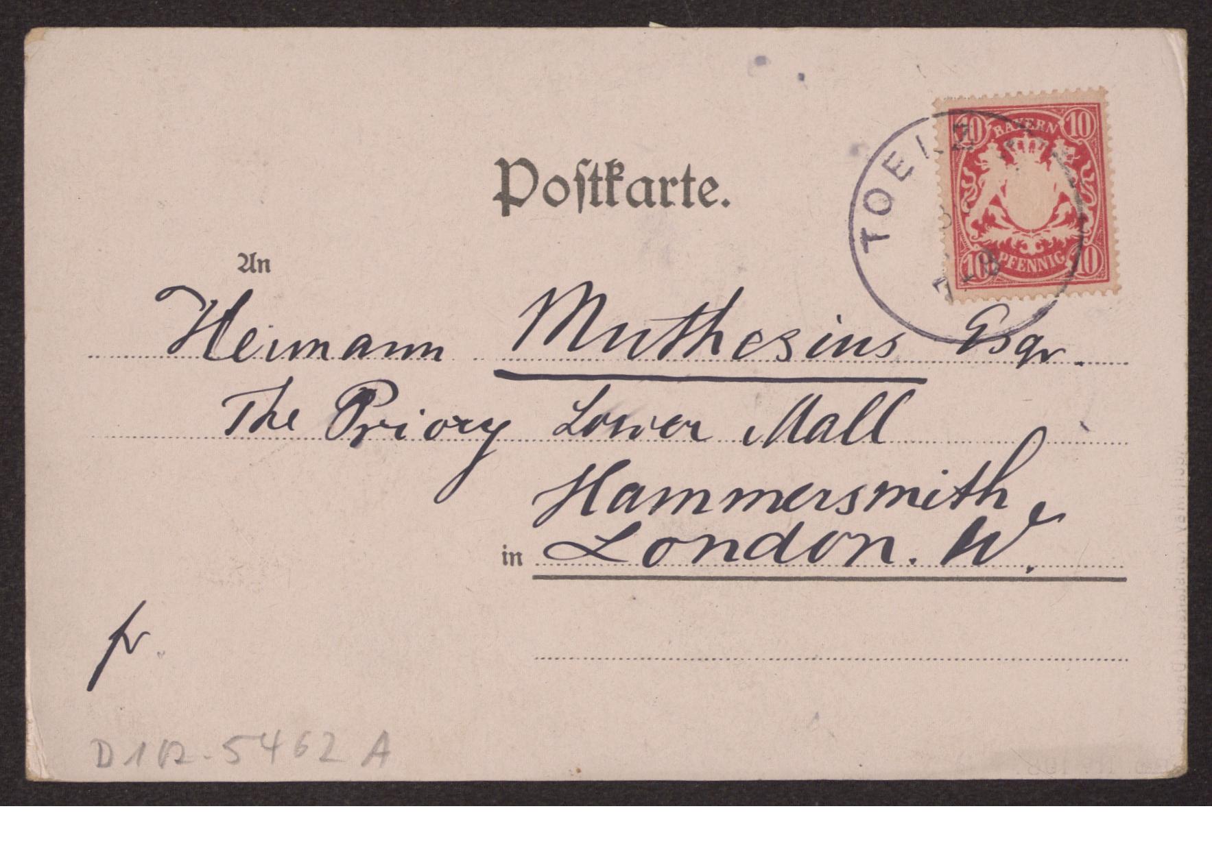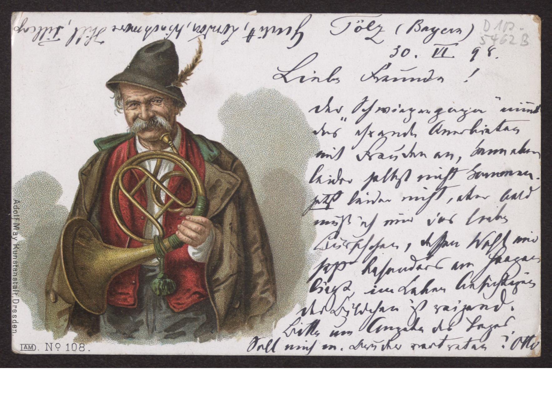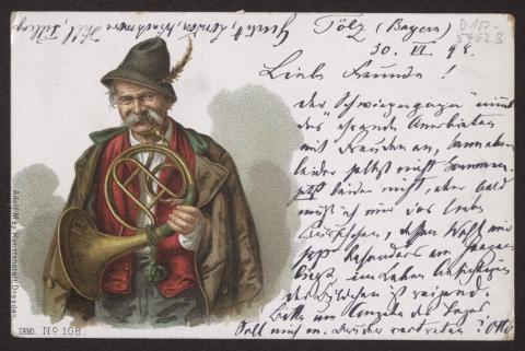 Transkription s. D 102-5497, zum Inhalt des Schreibens s. D 102-5503 Karte beidseitig beschrieben, auf der Grußseite eine farbige Zeichnung eines Musikers in Tracht, ein Waldhorn haltend, "Adolf May Kunstanstalt Dresden No. 108"