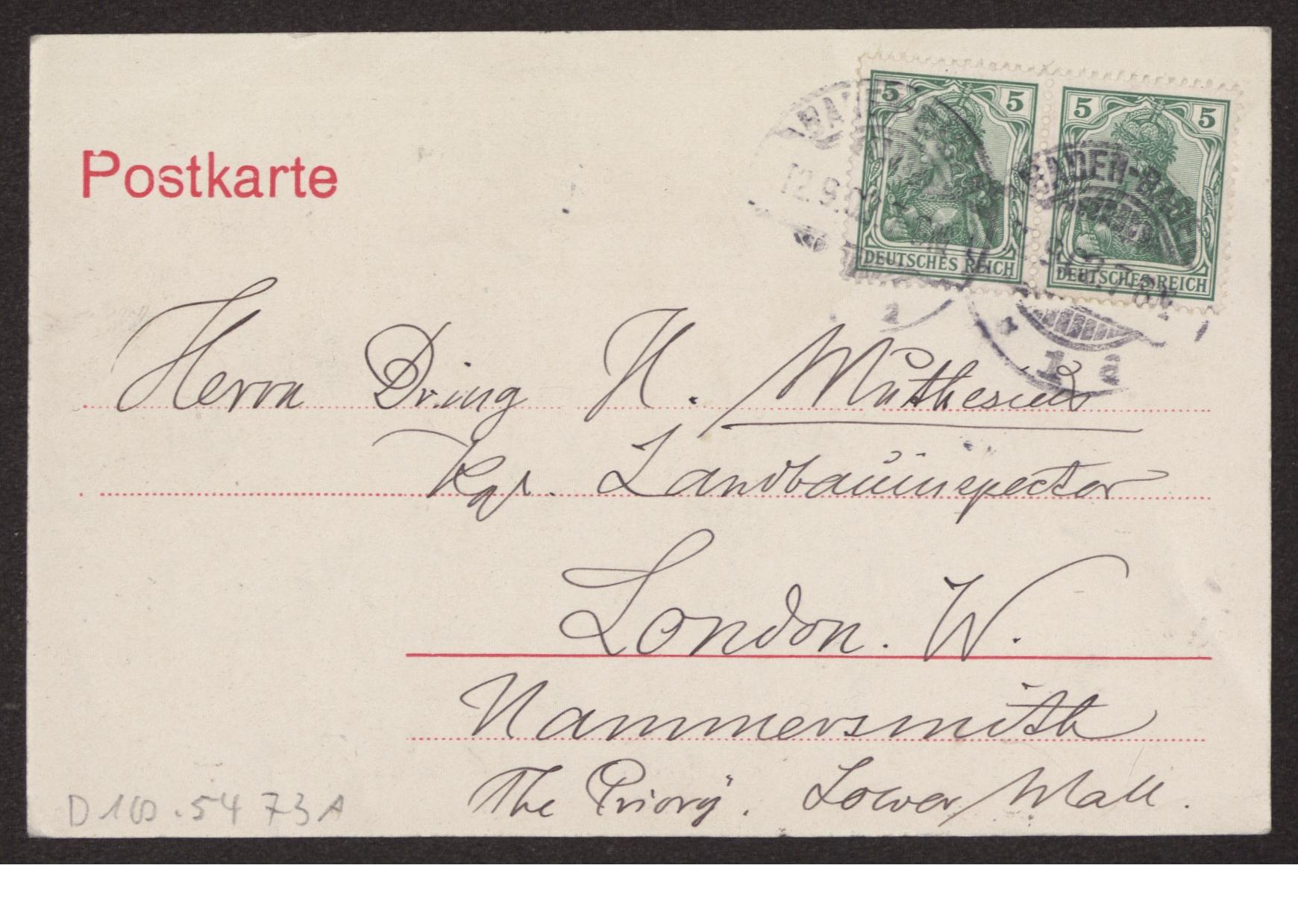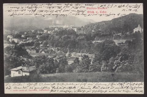 Transkription s. D 102-5496, zum Inhalt des Schreibens s. D 102-5503 Karte beidseitig beschrieben, Ansichtsseite zeigt s/w Foto: "Baden-Baden. Blick v. Echo". Am unteren linken Rand "C 14198 Lautz u. Isenbeck, Darmstadt".