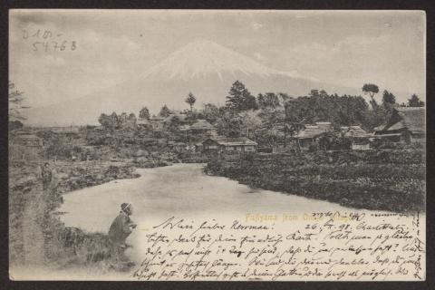 Transkription s. D 102-5497, zum Inhalt des Schreibens s. D 102-5503 Karte beidseitig beschrieben, Ansichtsseite zeigt s/w Foto: "Fujijama from Omija Village"