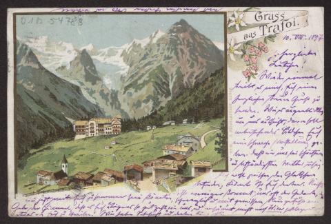 Transkription s. D 102-5500, zum Inhalt des Schreibens s. D 102-5503 Karte beidseitig beschrieben, Ansichtsseite zeigt farbige Zeichnung: "Gruss aus Trafoi", am rechten Bildrand "No. 10 S. Pötzelbeger Meran"