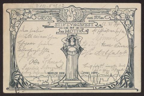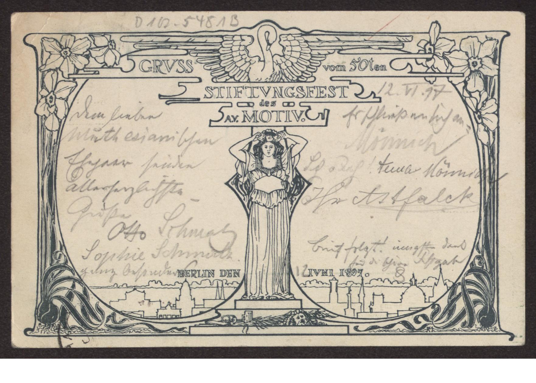 Transkription s. D 102-5499, zum Inhalt des Schreibens s. D 102-5503 Karte beidseitig beschrieben, Ansichtsseite zeigt s/w Zeichnung: "Gruss vom 50ten Stiftungsfest des A.V. Motiv. Berlin den Juni 1897"