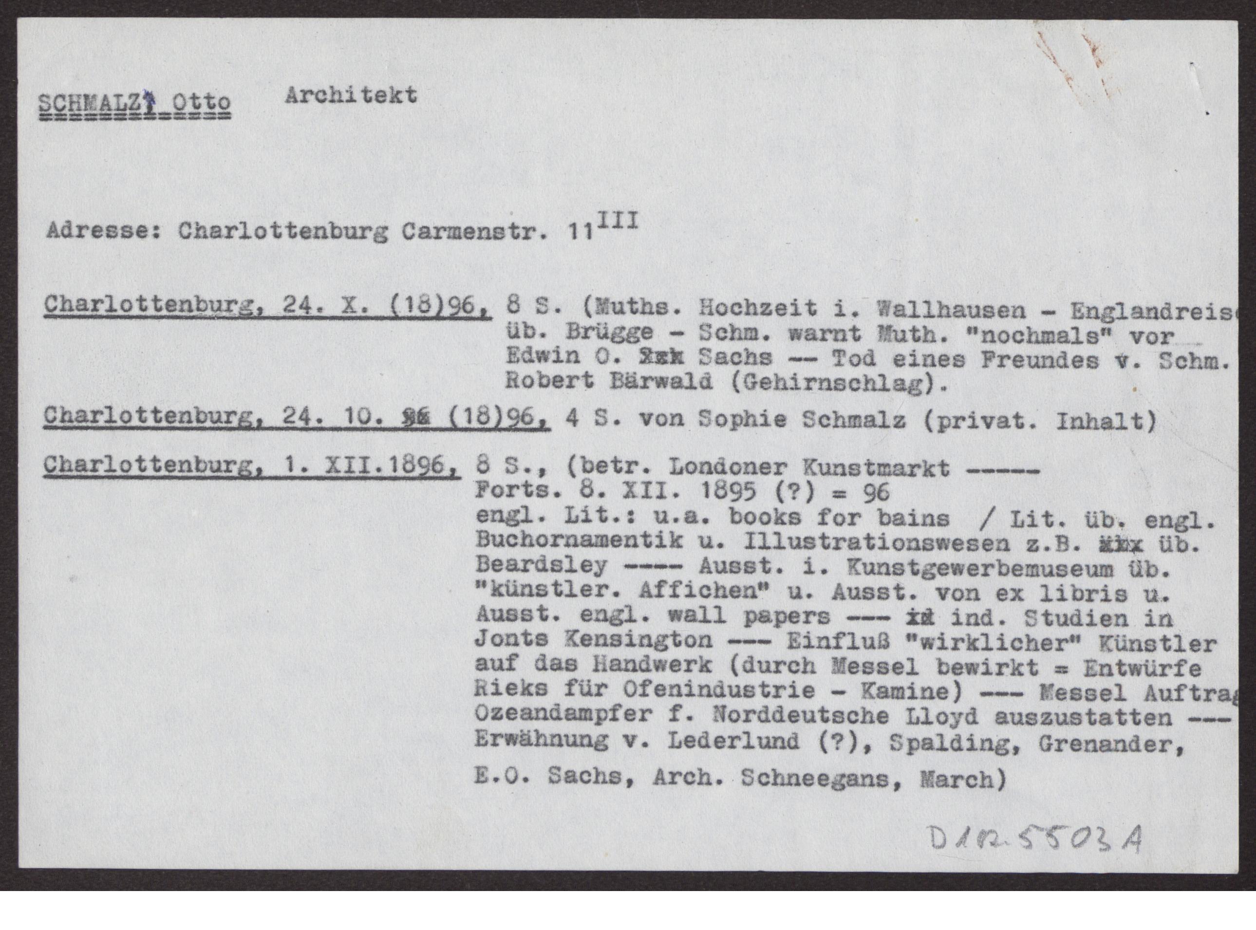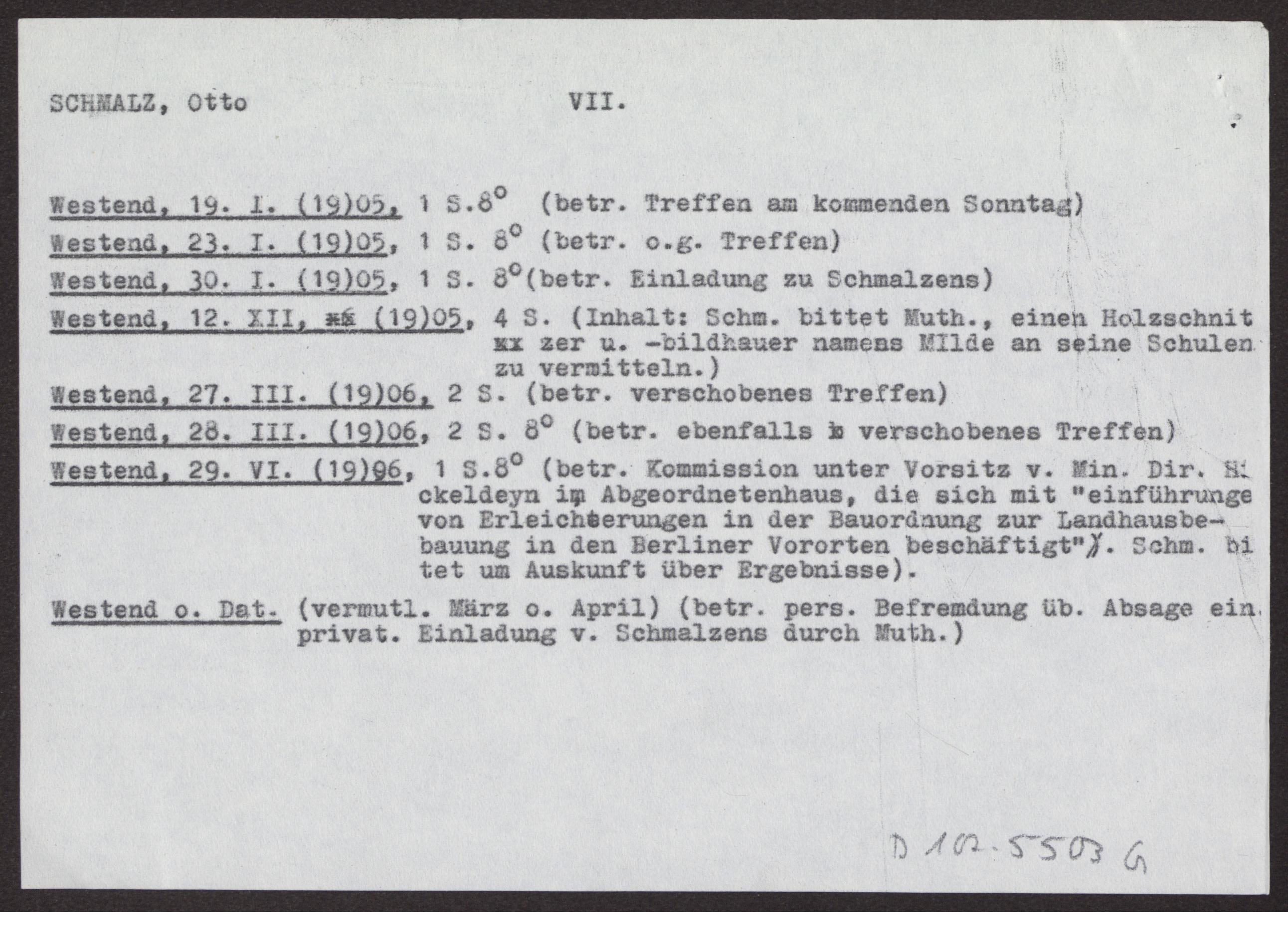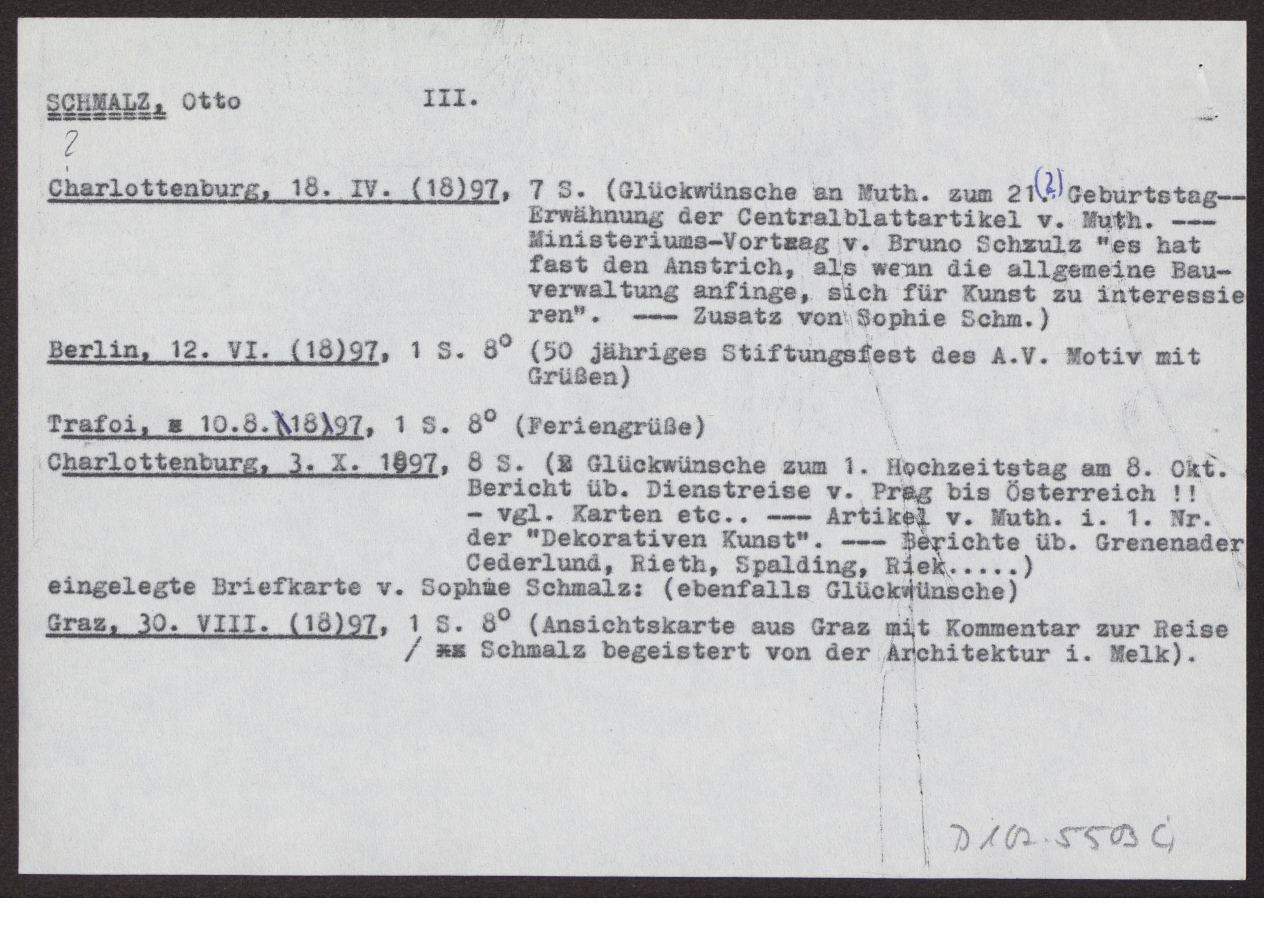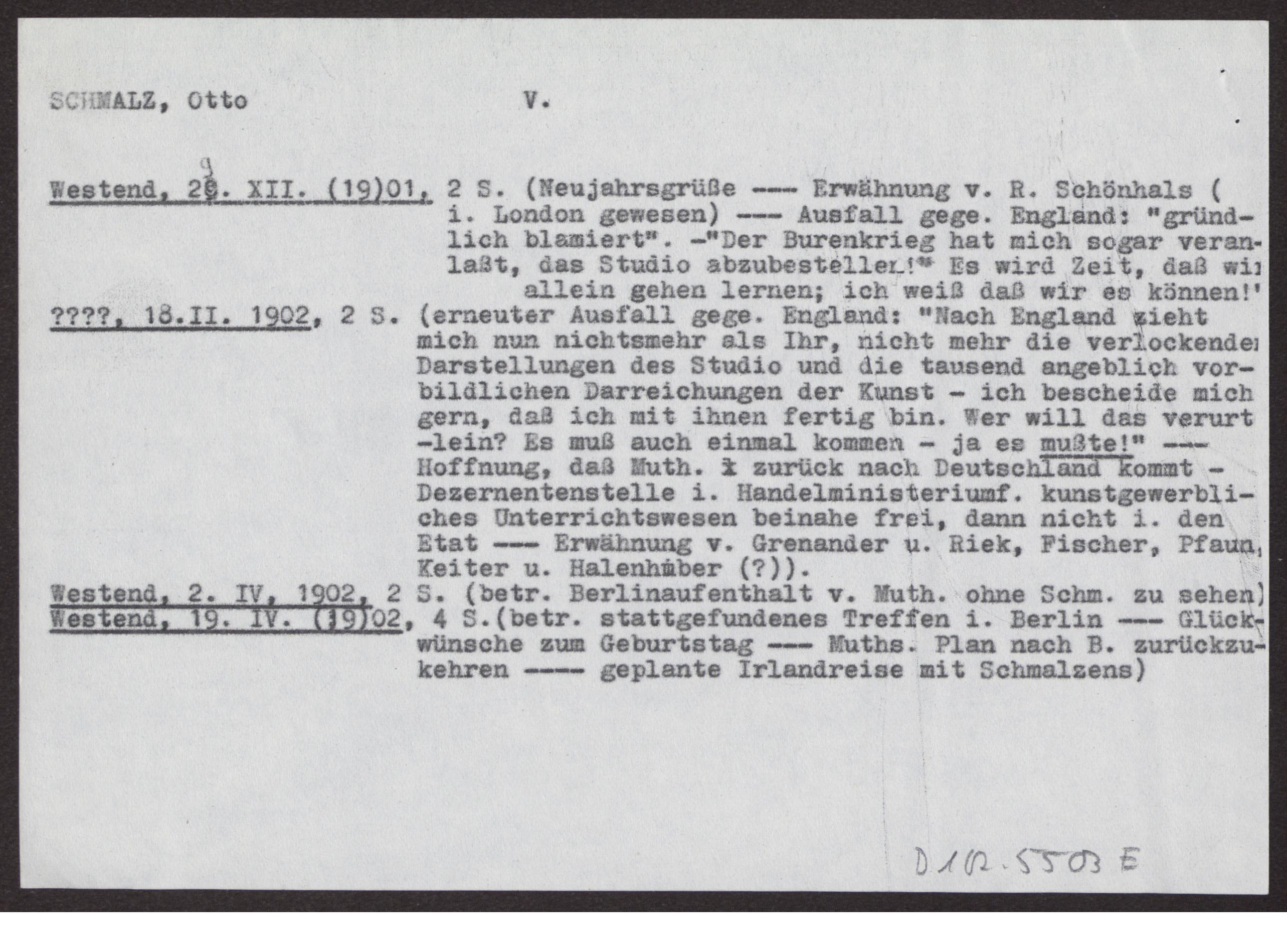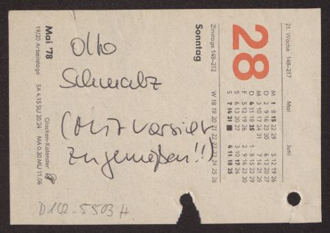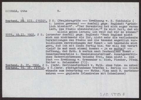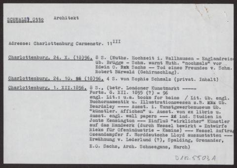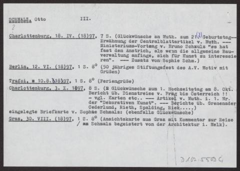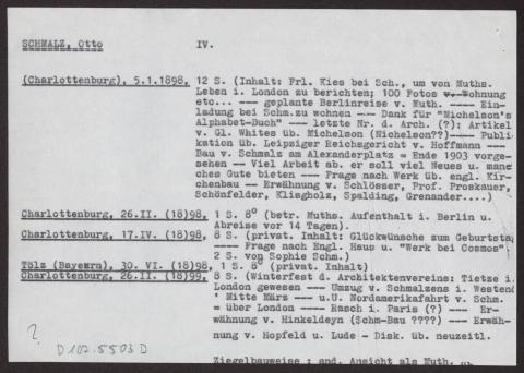 s. Einzelbriefe und Karten Sieben Blätter einseitig beschrieben, dazu ein Notizzettel des Bearbeiters des Nachlasses mit dem Vermerk "Otto Schmalz (mit Vorsicht zu genießen!)