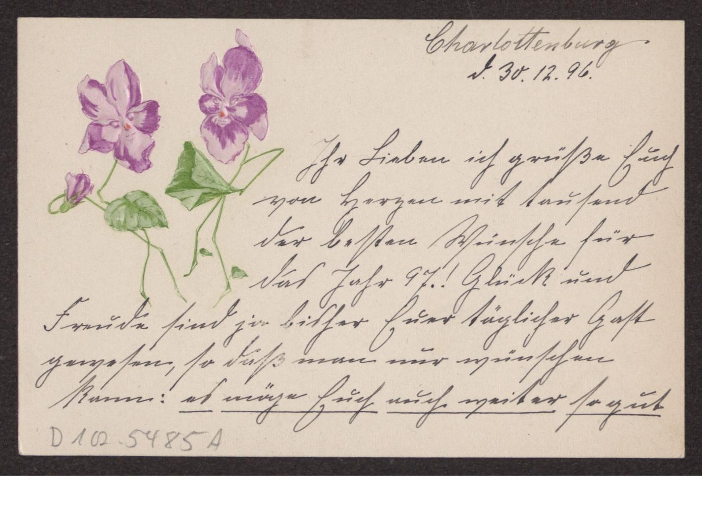 Transkription s. D 102-5501, zum Inhalt des Schreibens s. D 102-5503 Blatt beidseitig beschrieben, mit einer farbigen Zeichnung von zwei Stiefmütterchen, die ein Gesicht haben.