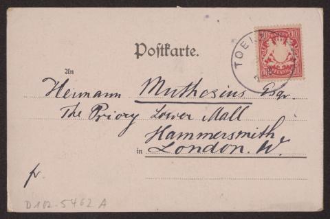 Transkription s. D 102-5497, zum Inhalt des Schreibens s. D 102-5503 Karte beidseitig beschrieben, auf der Grußseite eine farbige Zeichnung eines Musikers in Tracht, ein Waldhorn haltend, "Adolf May Kunstanstalt Dresden No. 108"