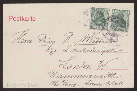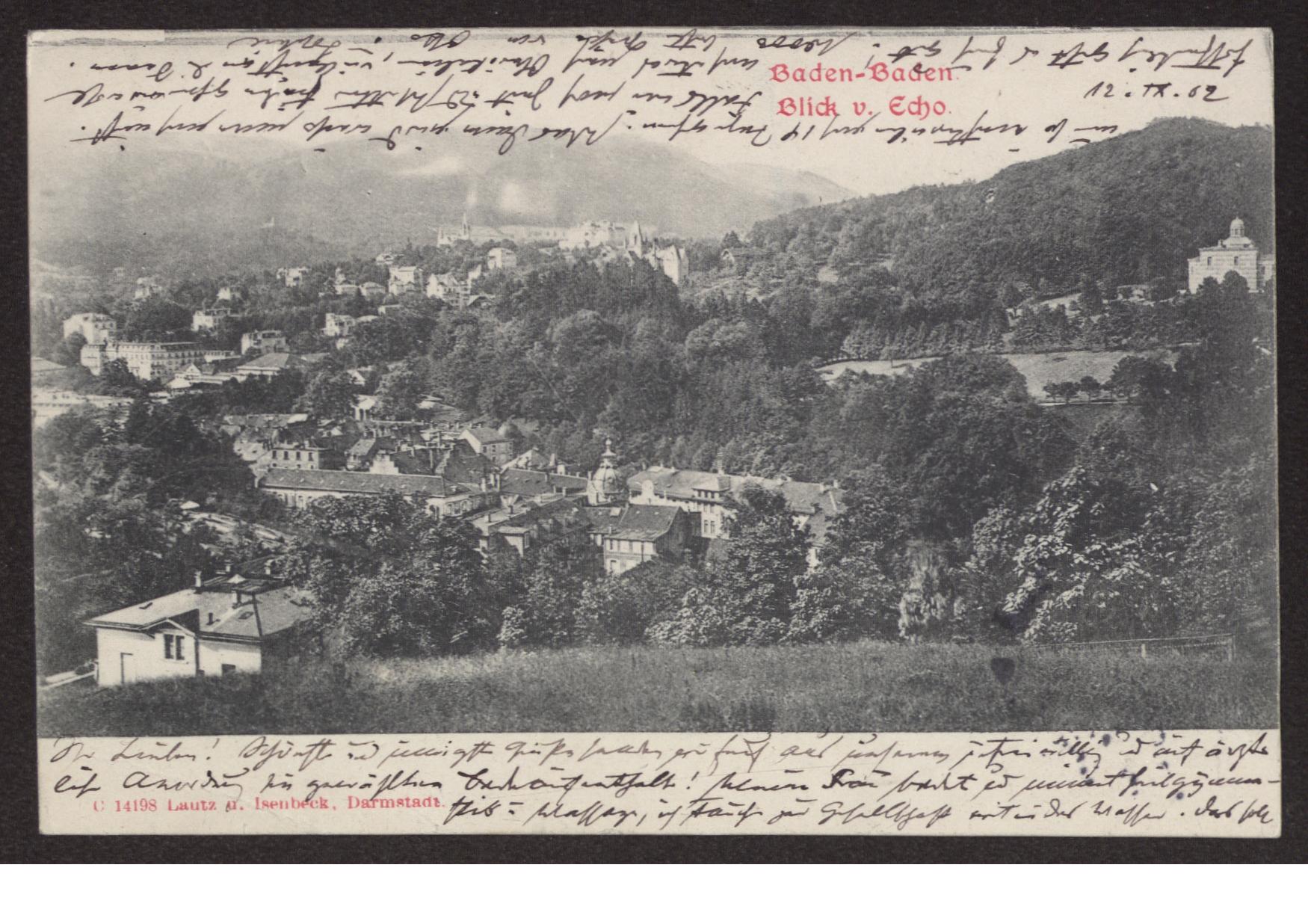 Transkription s. D 102-5496, zum Inhalt des Schreibens s. D 102-5503 Karte beidseitig beschrieben, Ansichtsseite zeigt s/w Foto: "Baden-Baden. Blick v. Echo". Am unteren linken Rand "C 14198 Lautz u. Isenbeck, Darmstadt".