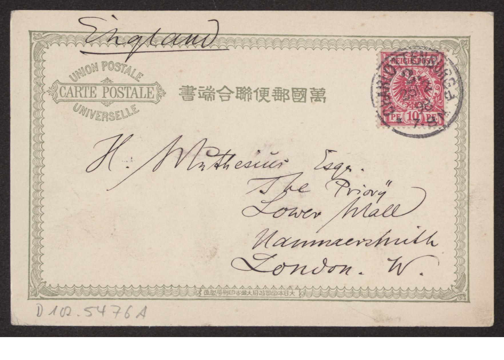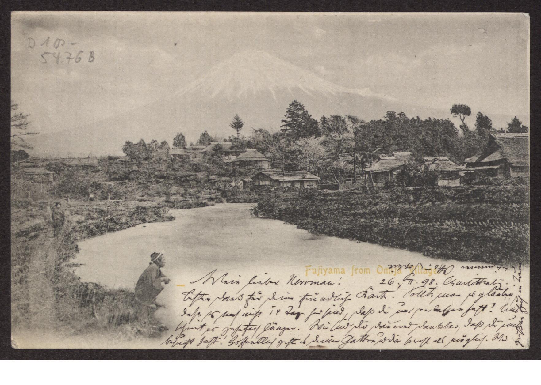 Transkription s. D 102-5497, zum Inhalt des Schreibens s. D 102-5503 Karte beidseitig beschrieben, Ansichtsseite zeigt s/w Foto: "Fujijama from Omija Village"