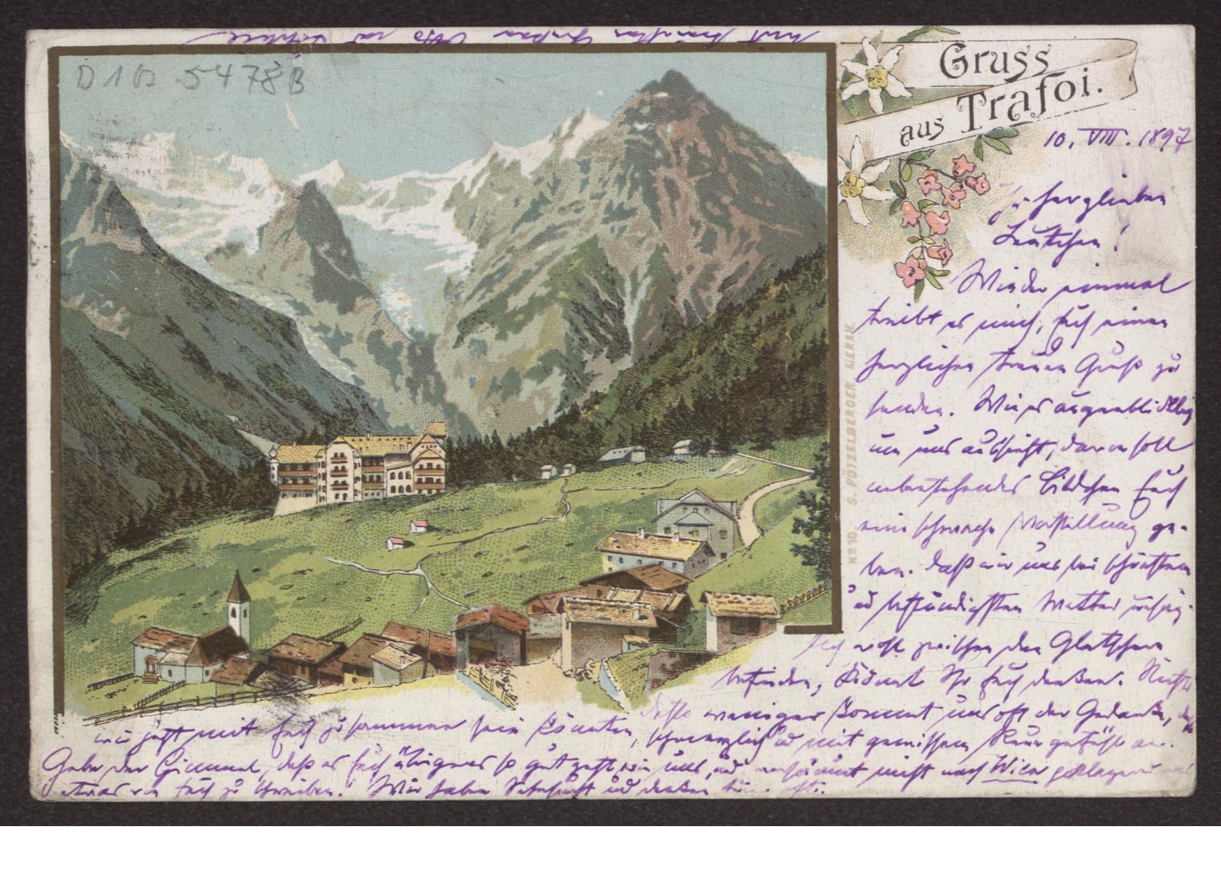 Transkription s. D 102-5500, zum Inhalt des Schreibens s. D 102-5503 Karte beidseitig beschrieben, Ansichtsseite zeigt farbige Zeichnung: "Gruss aus Trafoi", am rechten Bildrand "No. 10 S. Pötzelbeger Meran"